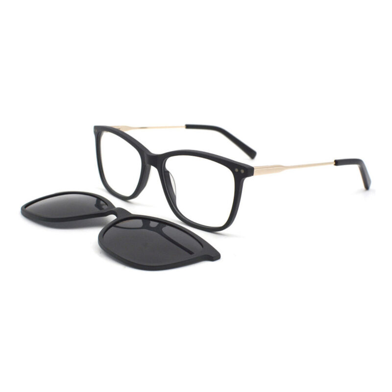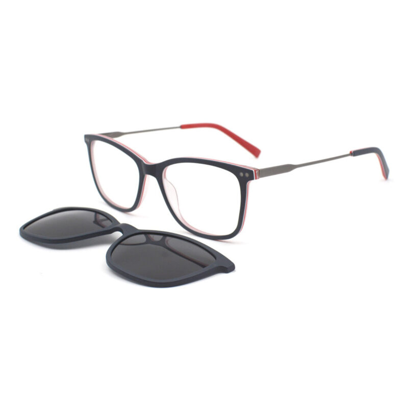 A classic, light, full frame with mat metallic temples and decorative pins. Assorted color clip on with polarized lenses