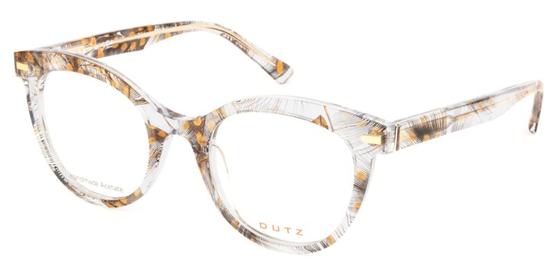 Elegant, transparent acetate frame, with gold accents and a lovely ostrich feather pattern. Assorted color acetate temples